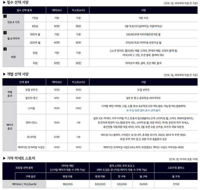 여기에 전트림 공통 사양인 스노우 화이트 펄(10만원), 아이보리 매트 실버/오션 블루 매트(50만원)을 선택할 수 있다.