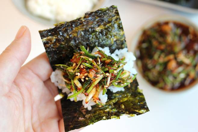 갓 만들었을 때는 마른김에 흰밥 싸서 같이 먹고요, 다음 날엔 콩나물밥이나 버섯밥, 전복밥 등을 만들어서 양념장으로 사용해보세요. 그럼 한 번 만들어서 두끼 해결 가능! 간이 딱 맞는 달래장 만드는방법 물 넣는 것 잊지 마시고 자세한 양념 비율은 아래에서 자세히 소개할게요.