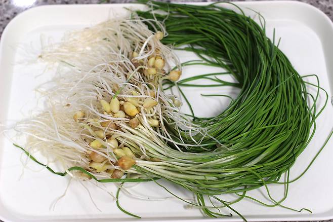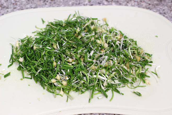 잘게 썰어줍니다. 너무 큰 알뿌리는 칼등으로 한 번 눌러 다지면 먹기 편해요.