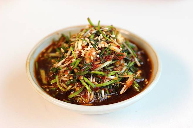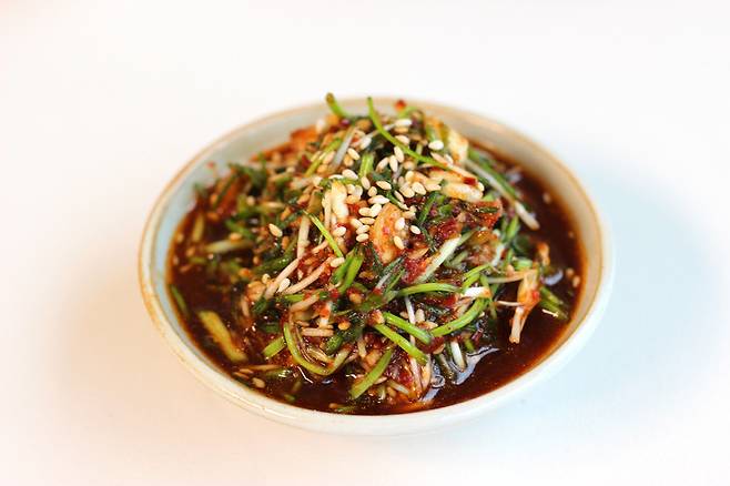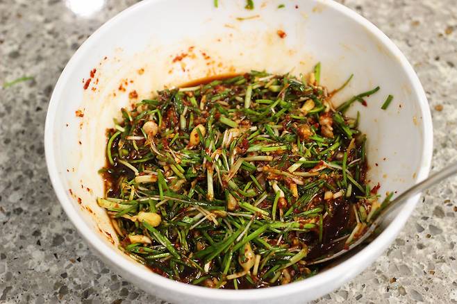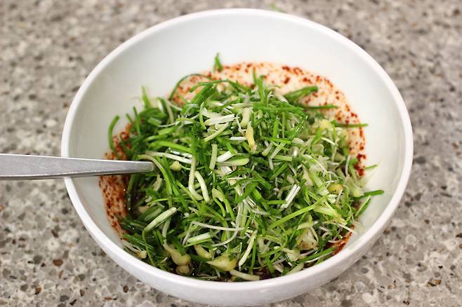 그다음 썰어둔 달래를 넣어요.