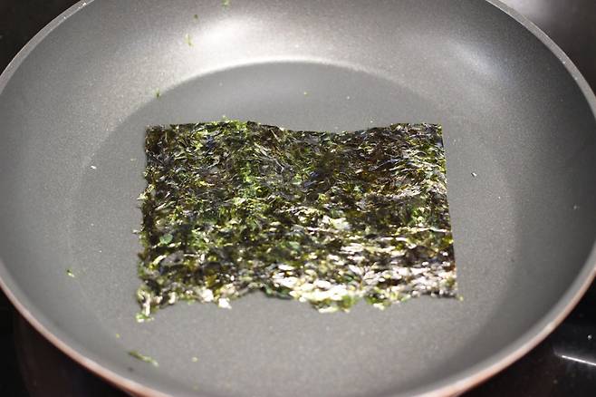 마른 김은 달군 후라이팬에서 1~2초 사이로 짧게 구워요. 김은 냉동실에서 보관하다가 먹기 직전에 이렇게 구우면 바삭하고 맛있어요.