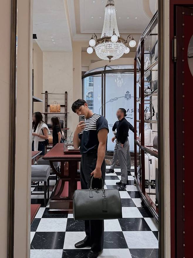 거울 속 그의 표정은 장난스러운데, 옷차림은 의외로 정제되어 있다. 이도현이 선택한 이번 스타일링은 2025년 여름 시즌의 핵심 키워드인 ‘클래식 리뉴얼’을 고스란히 반영한다. 세로 스트라이프가 들어간 블랙 티셔츠에 프라다 삼각 로고 백을 끌어안은 모습은 절제된 무드와 위트를 동시에 담아냈다.
