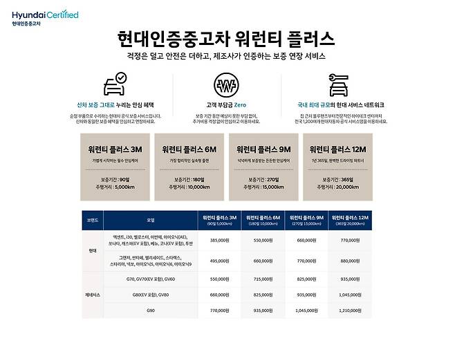 이 상품은 기존 인증중고차 기본 보증에 더해 추가 보장을 제공하는 맞춤형 보증 연장 상품으로, 차량 연식과 주행거리에 관계없이 현대인증중고차 구매 고객이라면 누구나 가입할 수 있다.