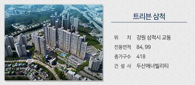 대한토지신탁이 시행하고 두산에너빌리티 시공하는 '트리븐 삼척'이 강원 삼척시 교동에서 분양합니다. 삼척시청, 삼척의료원, 홈플러스, 삼척중앙시장 등의 삼척 시내 다양한 생활인프라를 이용하기 쉽습니다. 동해대로, 동해고속도로, 7번국도 등으로 차량이동이 쉽습니다. 삼척초, 정라초, 청아중, 삼일중, 삼척고, 삼척여고, 강원대 삼척캠퍼스 등의 교육시설도 인접해 있습니다.