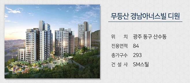 SM스틸이 광주 동구 산수동에 짓는 '무등산 경남아너스빌 디원'을 분양합니다. 무등산국립공원이 인접해 대규모 숲, 녹지 공간을 집 앞에서 누릴 수 있는 쾌적한 환경을 갖췄습니다. 도보 거리에 장원초가 있으며 충장중, 살레시오여고 등의 학군을 갖습니다.