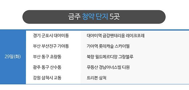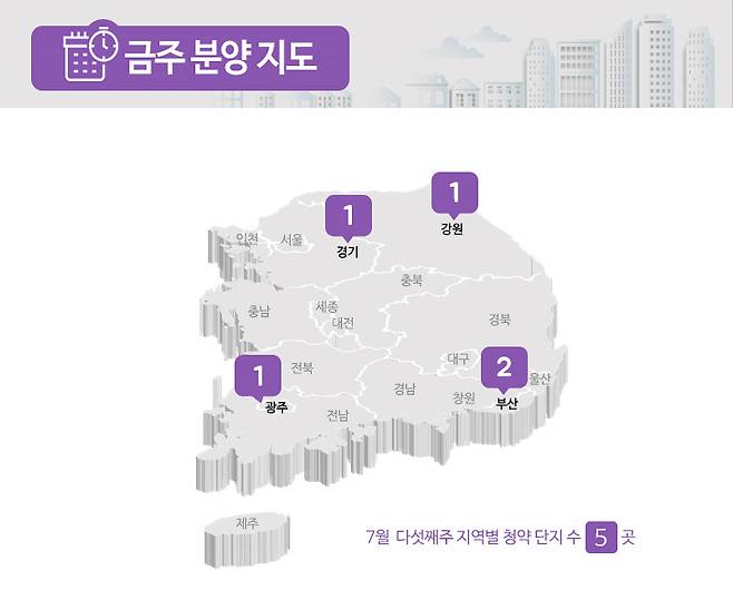 부동산인포에 따르면 7월 5주 청약에 나서는 곳은 5곳, 2100가구 입니다(총 가구수 기준).