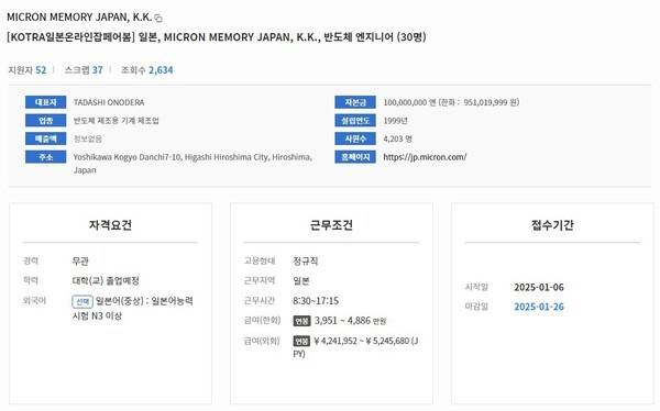 HBM 시장 3위인 미국 마이크론은 지난달 일본 히로시마 공장에서 일할 한국 엔지니어 모집을 진행했다.