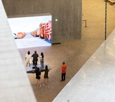 ‘떠다니는 박물관’을 콘셉트로 공간을 설계했다는 스위스 건축회사 헤어초크&드뫼롱(Herzog & de Meuron)의 설명처럼 엠플러스는 홍콩의 도시 경관과 상호작용하는 건물의 미니멀한 디자인이 돋보인다. 지하 7층과 지상 10층으로 이뤄진 건물은 거꾸로 놓인 T자 모양이며, 지하는 수장고를 포함한 대규모 전시 공간을 이루고 있다. 지하 2층의 파운드 스페이스(Found Space)에서 만난 엠플러스 마케팅 담당자가 “이 건물 아래에는 공항 철도가 지나는 터널이 있어요.”라고 귀띔한다. 즉, 파운드 스페이스는 터널의 윤곽을 따라 완성된 전시장인 것. 한국을 대표하는 설치 예술가 양혜규의 〈소리 나는 구명 동아줄(Sonic Rescue Ropes)〉이 1층 로비 천장부터 지하 2층 바닥에 닿을 듯 말 듯 길게 드리워 있다. 설치 미술과 몰입형 전시가 펼쳐지는 이 공간에서는 무료로 전시 관람이 가능하다. 건물을 가로지르는 지름길을 통해 언제든 예술과 우연히 만날 수 있도록 모두에게 개방됐다.