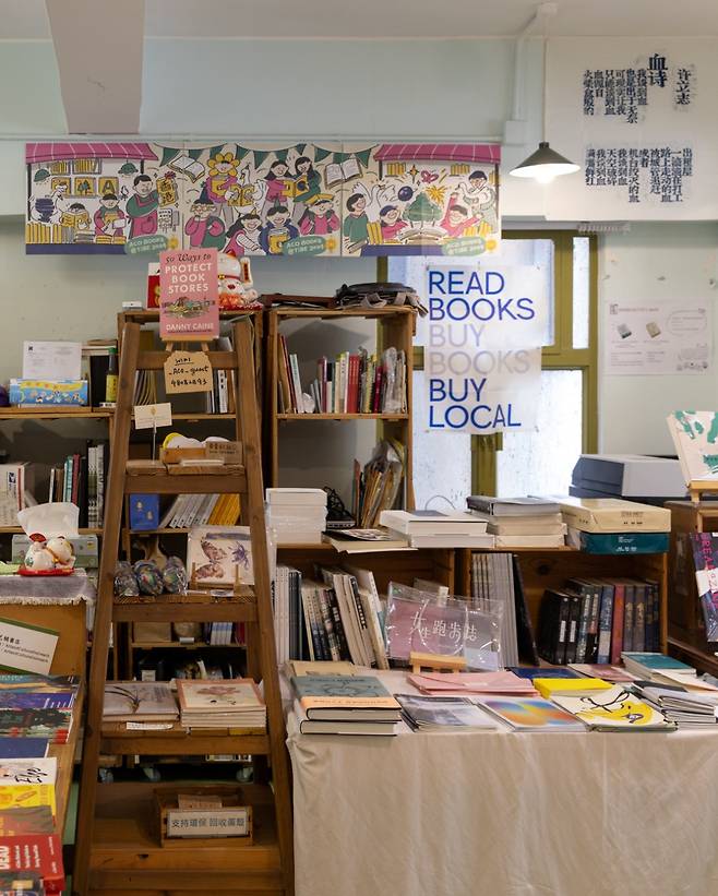 홍콩의 높은 빌딩 숲을 거니는 동안 자주 드는 생각 하나. 건물의 윗층에서는 과연 어떤 삶이 펼쳐지고 있을까? 여행자가 드나드는 대부분의 상업 시설은 저층에 자리하고 있으니 말이다. 오래된 건물 14층에 자리한 예술 독립서점 아코 북스가 모든 것을 대변할 순 없겠지만, 적어도 약간의 궁금증은 해소할 수 있을 듯하다. 그래픽 디자인과 광동어를 입힌 스티커, 전시 포스터가 덕지덕지 붙은 엘리베이터를 타고 건물 가장 꼭대기 층으로 향한다. 엘리베이터 안 풍경만으로도 이 건물에 분명 예술 서점이 있을 거라는 확신이 든다.