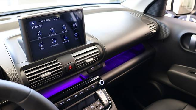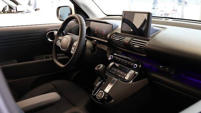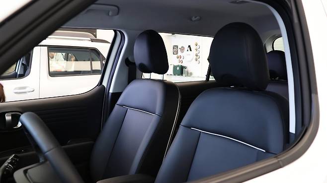 실내 디자인에 큰 차이점은 없다. 전시 차량은 8인치 센터 디스플레이와 4.2인치 LCD 디지털 클러스터로 인포테인먼트가 마련되지만, 페이스리프트 이후 최대 10.25인치 모니터를 탑재할 수 있게 되었다. 스크린은 모두 플로팅 타입으로, 대시보드를 2층 구조로 분할하여 수납 공간을 마련했다. 그 외 버튼식 공조장치와 레버 타입 기어 노브, 드라이브 모드 다이얼이 배치된 모습이다. 스티어링 휠도 기존 D컷 형상과 동일하며, 시트는 벤치 타입이다. 옵션으로 1열 폴딩 시트를 선택하여 레저 활동에서 편리하게 활용할 수 있다.