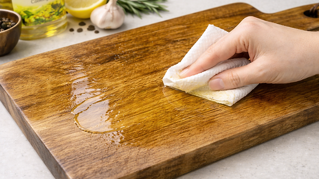비교적 산화 안정성이 있는 카놀라유나 포도씨유가 낫고, 가장 이상적인 선택은 도마 전용 식품용 미네랄 오일입니다.