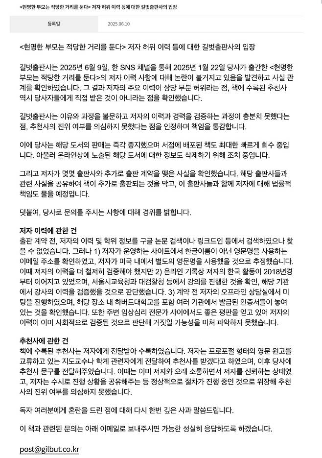 해당 책을 낸 길벗출판사는 전날 홈페이지에 공개한 입장문을 통해 “당사가 출간한 ‘현명한 부모는 적당한 거리를 둔다’의 저자 이력 사항에 대해 논란이 불거지고 있음을 발견하고 사실 관계를 확인했다”며 “그 결과 저자의 주요 이력이 상당 부분 허위라는 점, 책에 수록된 추천사 역시 당사자들에게 직접 받은 것이 아니라는 점을 확인했다”고 밝혔습니다.