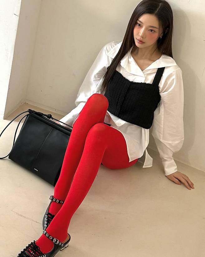 이시안이 선택한 레드 스타킹은 단순한 아이템이 아니다. 봄을 기다리는 설렘과 열정을 담은 듯한 강렬한 색감이 인상적이다. 흔히 모노톤의 코디에 활용되기 어려운 컬러지만, 그녀는 블랙과 화이트의 조합 속에서 완벽한 밸런스를 잡아냈다. 전체적인 스타일링은 트렌디하면서도 감각적인 무드를 자아낸다.
