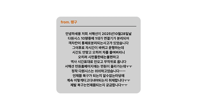 사고 이후 코레일은 다원시스 열차 10대를 점검하기 위해 일산역 구간 운행 횟수를 62회에서 14회로 대폭 축소했다. 출퇴근 시간대 열차가 연착되고, 혼잡도가 높아지면서 이용객들 사이에선 “압사 공포를 느꼈다” “숨도 잘 못 쉬겠다”는 울분과 비난이 폭주하고 있다.