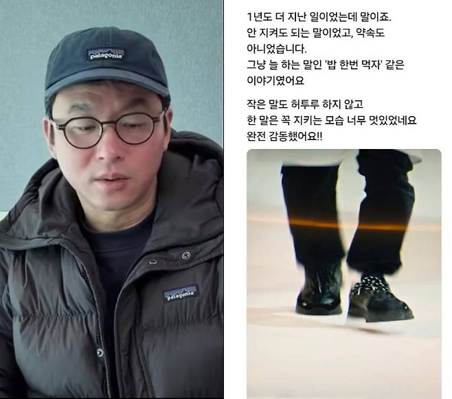 A씨는 "1년도 더 지난 일이었는데 말이다. 안 지켜도 되는 말이었고, 약속도 아니었다. 그냥 늘 하는 말인 '밥 한번 먹자' 같은 이야기였다"면서 "작은 말도 허투루 하지 않고 한 말은 꼭 지키는 모습 너무 멋있었다. 완전히 감동했다"고 덧붙였다.