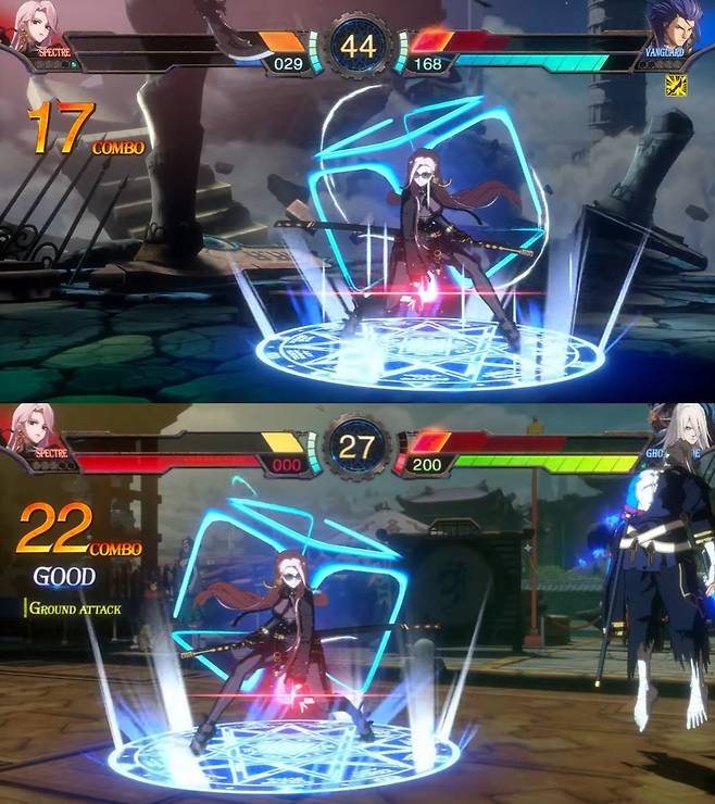이외에도 게임 플레이 자체의 변경점도 일부 보입니다. 기본기에서 잡기나 점프 등 다른 동작으로 캔슬할 수 있게 된 것이 대표적인데, 후딜이 긴 5B, 2B를 잡기로 캔슬해 MP 소모 없이 압박을 이어가는 뱅가드와의 대전 영상에서 그 활용을 엿볼 수 있습니다. 신규 시스템과 더불어 대전에 지대한 영향을 줄 것으로 보입니다.