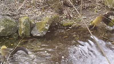 물장난 치는 담비 2마리의 모습도 변산반도 내변산 일대에서 포착됐다. 담비는 잡식성으로 쥐, 토끼 등 포유류를 비롯해 새, 나무 열매 등 다양한 먹이를 먹으며 활동하는 자연 생태계 최상위 포식자다.