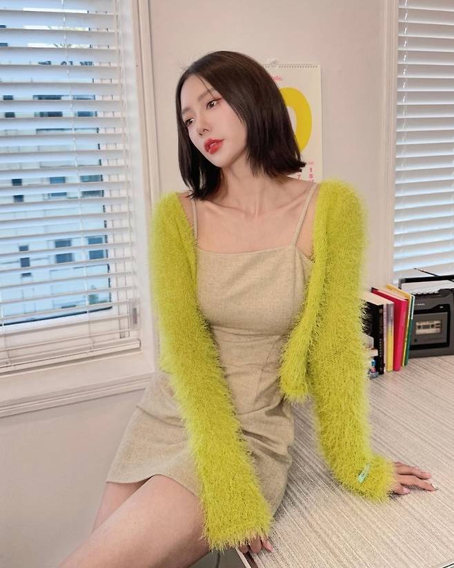 베이지 원피스 + 네온 퍼 가디건 – 미니멀한 베이지톤에 네온 컬러로 트렌디한 개성을 더한 믹스매치룩.