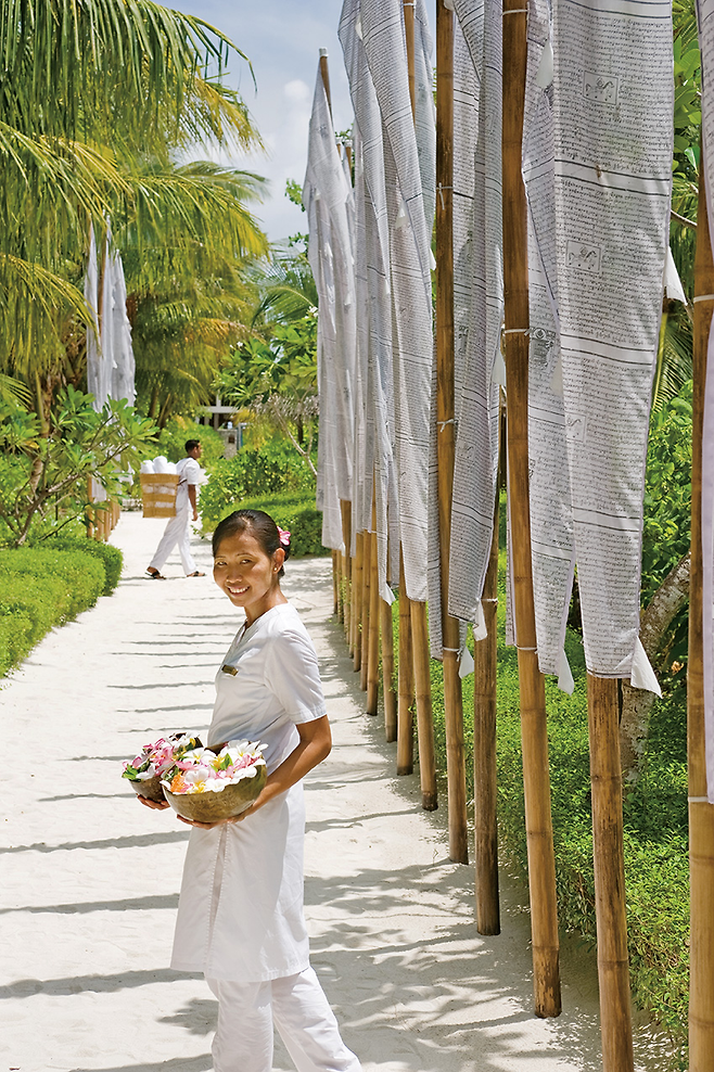 아래로 투명한 바다가 나타나기 시작했다. 저마다 모양을 달리한 리조트를 상공에서 바라보니 그제야 몰디브에 온 것이 실감 났다. 30분의 비행 후 드디어 목적지가 보였다. 란다 기라바루는 일상과 전혀 다른 날을 꿈꾸며 몰디브의 럭셔리 리조트를 한 번이라도 찾아본 이들이라면 알 법한 이름이다. 동시에 리조트가 사실상 여행의 전부가 되는 몰디브를 처음 찾는 (나 같은) 여행자에겐 몰디브 리조트의 기준치를 한없이 올려주는 장소다. 가로수 길이 펼쳐진 로비로 가는 길은 지상낙원으로 입성하는 듯했다. 하늘을 올려다보니 까마귀만 한 박쥐들이 날아다닌다. 문득 눈을 감으면 새소리가 귓가에 파고든다. 우거진 신록 사이로 바닷바람이 유영하는 길을 지나 로비에 앉아 코코넛 워터를 들이켜며 생각한다. 이토록 완벽한 입도(入島)가 또 있을까.