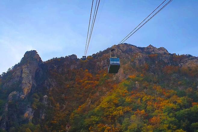 케이블카를 타고 창문 너머로 울산바위와 만물상 등을 포함한 단풍으로 물든 아름다운 산세를 감상할 수 있습니다.