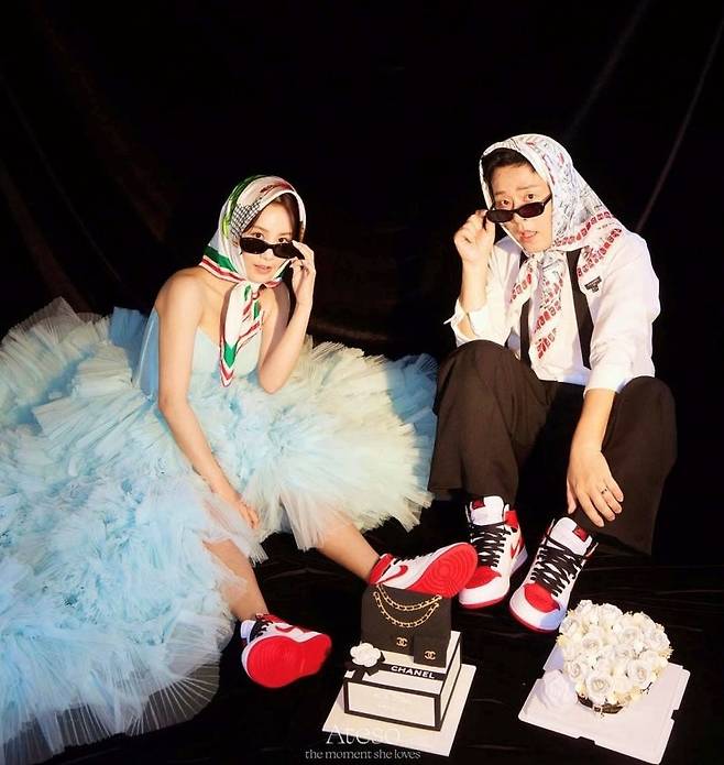 힙스터 감성 뿜뿜하는 화보도 놓칠 수 없죠! 김지민 님은 블루 튜브톱 드레스에 김준호 님과 빨간 운동화, 스카프, 선글라스로 커플룩 완성! 흔하지 않은 감각적인 콘셉트, 진짜 존경합니다… 💖