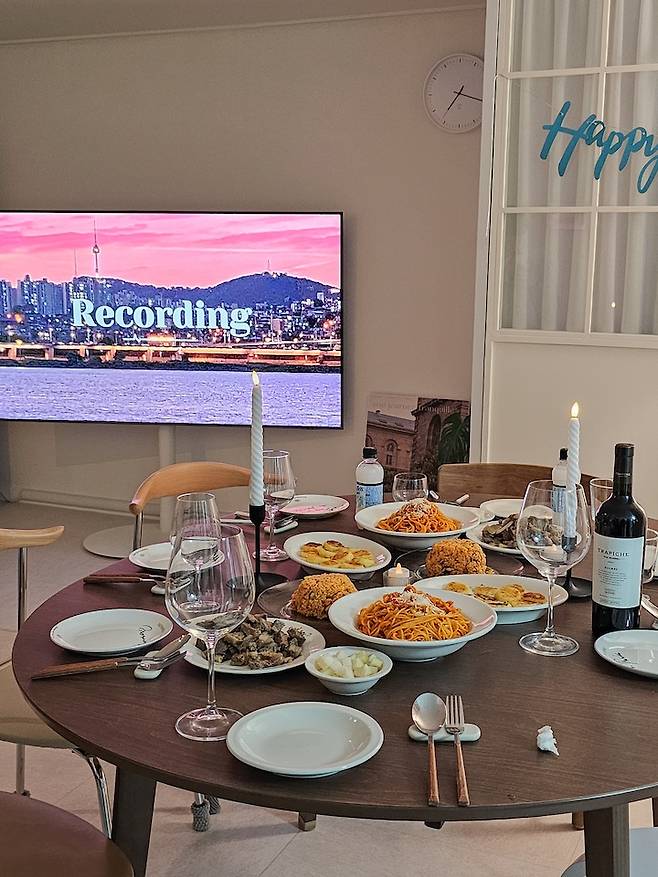 이 유리 파티션이 좋은 이유는 이렇게 좋은 포토존이 되는 겁니다! 크리스마스, 생일, 새해 등등 날마다 가랜드를 바꾸는 재미가 있더라고요. 그리고 월넛 식탁에 예쁜 식탁보를 깔면 그냥 파티룸 그 자체예요 +_+