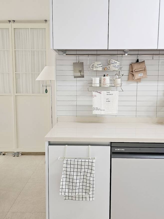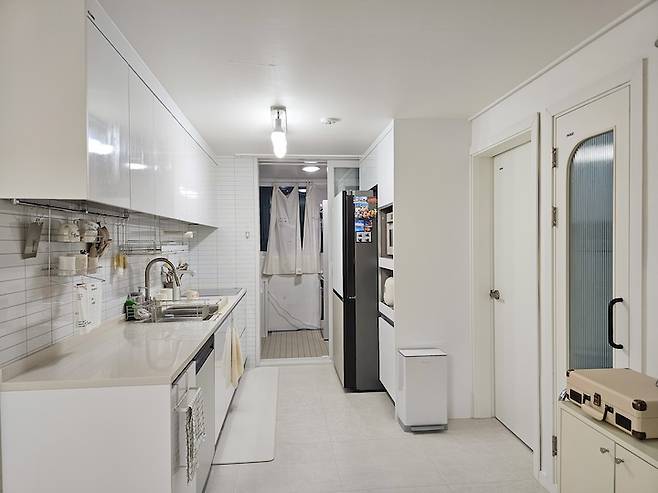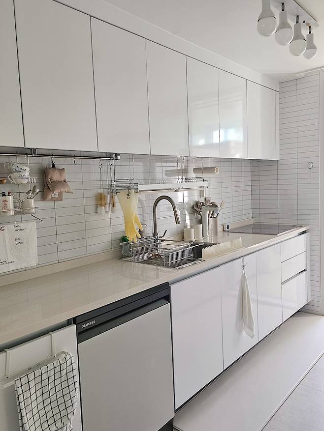 구축의 특징인 일자형 주방이에요. 처음에는 주방에 식탁이 들어가지 않는 구조라서 아쉬움이 많았지만, 그래도 나름 요리하기 편한 동선이라서 만족하고 있습니다. 주방도 올 화이트톤으로 맞췄어요!