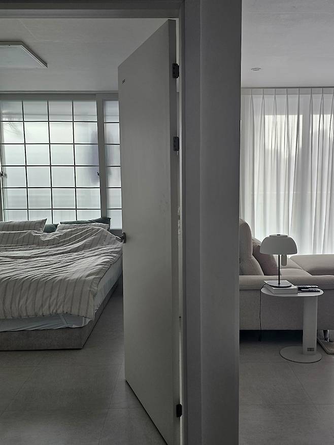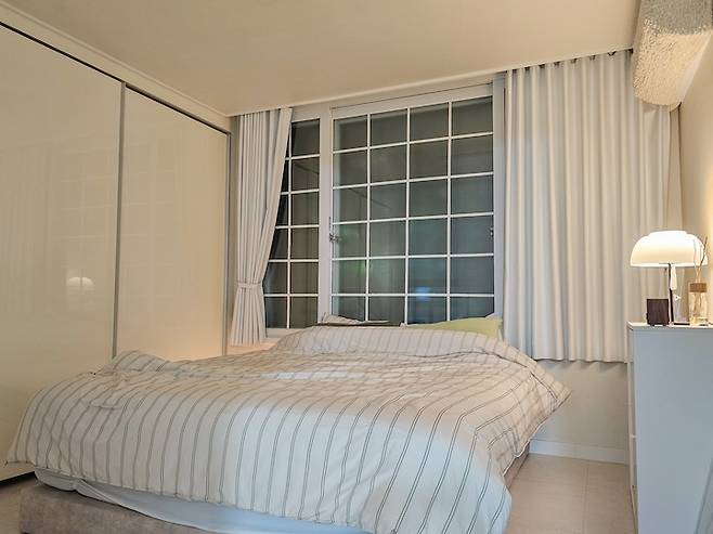 신혼집 침실은 수면에 집중하기 위해 침대만 심플하게 있어요! 우선 격자무늬 창문은 저희 남편이 셀프로 붙여주었답니다! 내부 샷시(새시)를 교체하지 않아도 교체한 기분이 들죠?
