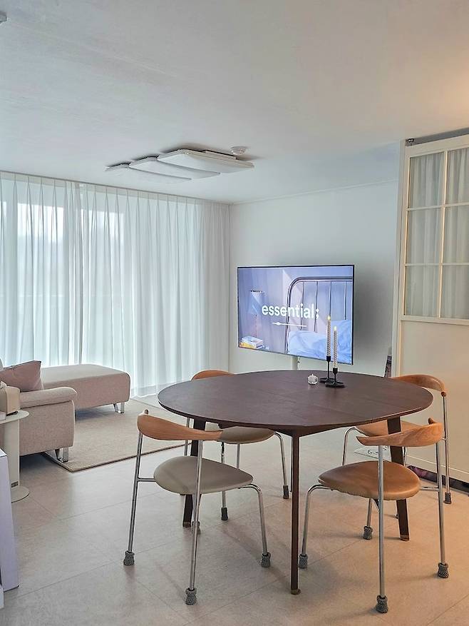 소파를 기준으로 바라본 거실이에요! 거실과 주방 사이에 있는 식탁은 저에게 아주 중요한 요소인데요. 방금 위에서 본 식탁과 지금 보이는 식탁 차이점이 보이시나요? 바로 집들이 장인에게 필요한 확장형 식탁이에요!
