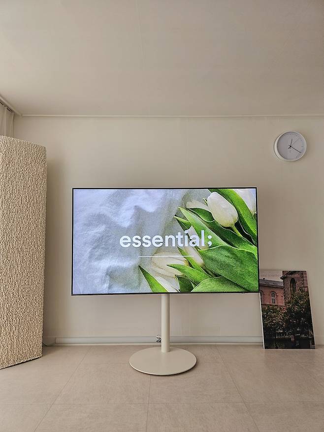 소파와 TV 위치를 뒤바꿔 배치했습니다! 그러다 보니 벽에 벽걸이 TV를 걸 수 없게 되어서 TV 스탠드를 선택하게 되었어요!
