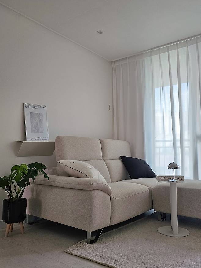 그리고 식탁을 거실에 두다 보니 답답해 보일까 봐 큰 소파를 살 수가 없어서 발품을 엄청나게 판 결과, 'ㄱ자 형태'의 제가 딱 원하는 헤드레스트 소파를 찾게 되었어요! 아주아주 만족하고 사용 중입니다!
