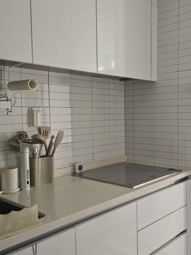 주방은 전등 빼고 전부 교체했어요! 그리고 타일을 세로로 붙일까 하다가 가로로 붙였는데, 오히려 공간이 더 넓어 보이더라고요!