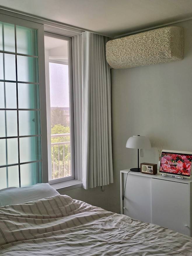 저층이라 푸르른 나무들이 빼꼼 보이는 이 각도를 제일 좋아해요. 밤에는 무조건 암막 커튼을 치고 있는데, 아침에 일어나서 커튼을 걷고 창문을 열면 저도 모르게 기분이 좋아지더라고요.