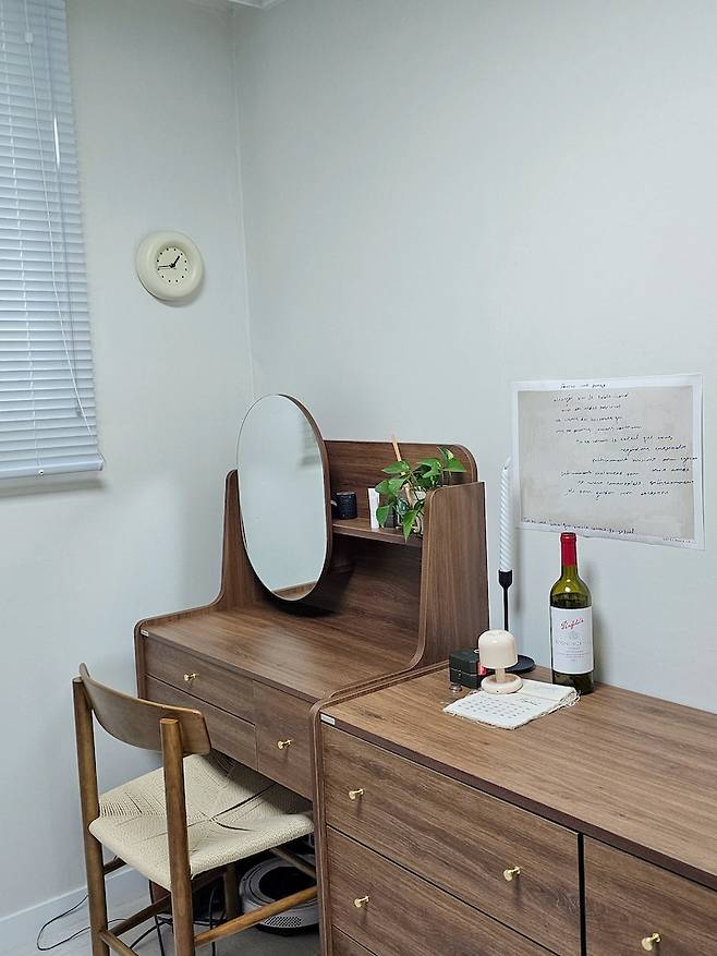 역시 드레스룸 가구도 어떤 색상으로 할지 고민하다가 결국엔 월넛을 선택했어요! 화이트 인테리어에 월넛 가구가 무게를 잡아 주는 데는 딱이더라고요. 미니멀한 화장대와 서랍장을 세트로 두니까 훨씬 이쁜 것 같아요 :)