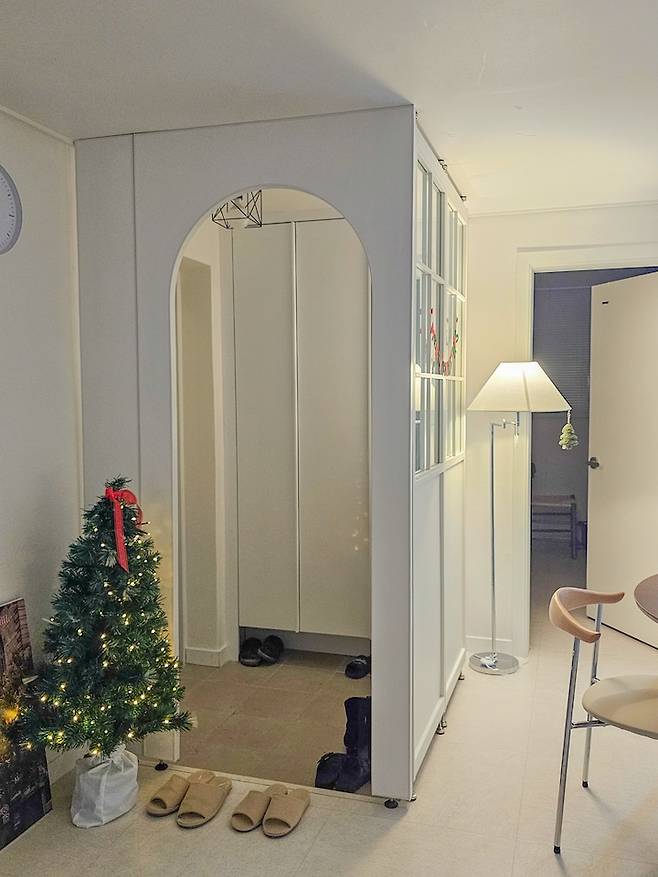 라운드 파티션과 유리 파티션을 따로따로 구매해서 남편이 2시간을 들여 셀프로 설치했습니다! 저희 집은 복도식도 아니고, 1층도 아니어서 소음이 덜 하기 때문에 굳이 문이 설치되지 않아도 되겠더라고요.
