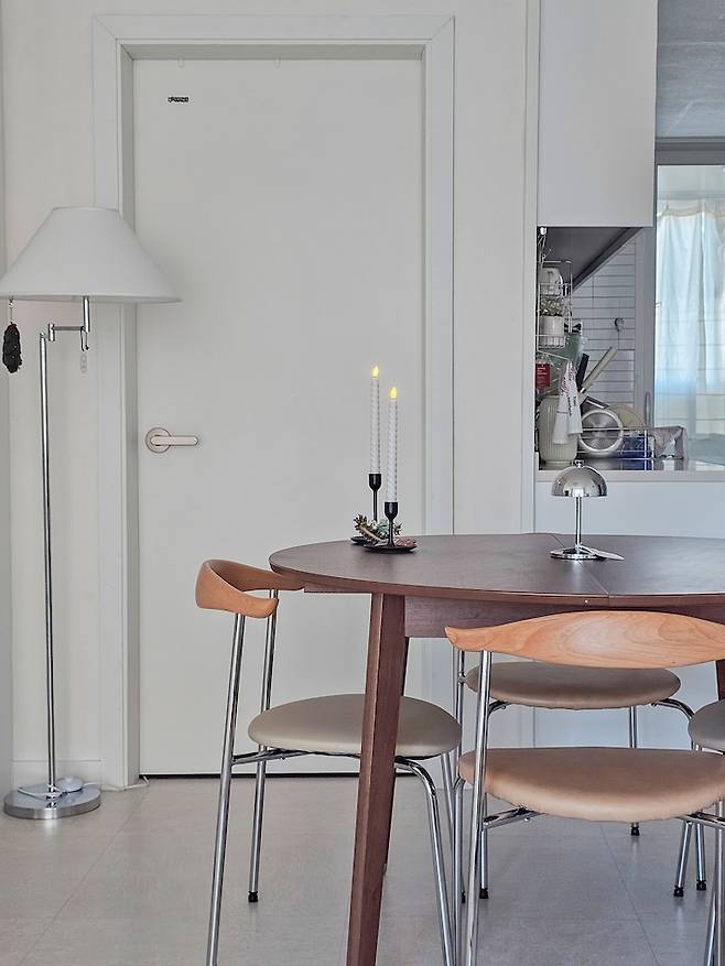 평소에는 남편과 2명이서 사용하는 원형 식탁이면서, 식탁 양쪽을 잡아당기면 타원형 식탁으로 최대 7명까지도 사용 가능해요. 올 화이트 리모델링을 했기 때문에, 집에 무게감을 잡기 위해 월넛 가구를 선택했어요.