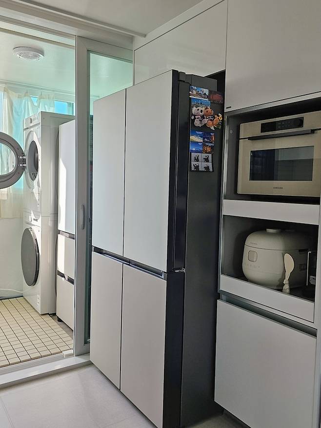 베란다에 세탁기+건조기와 김치냉장고, 그리고 냉장고 장엔 키친핏 대신 일반 냉장고를 넣었어요. 남편은 요리하는 걸 좋아해서 죽어도 키친핏은 못 사용하겠다고 해서 일반 사이즈를 샀는데, 실제로 요리를 많이 해먹어서 키친핏 샀으면 큰일 날 뻔했습니다ㅎㅎ