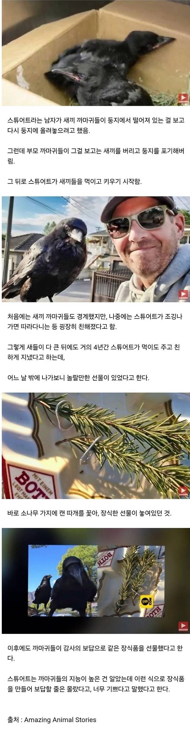 자신을 치료하고 먹이를 준 남자에게 보답한 까마귀