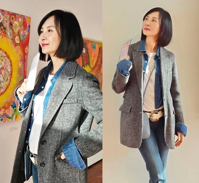 공개한 사진에서 채시라는 데님 팬츠와 화이트 티셔츠에 데님 셔츠를 입고 트위드 재킷을 걸친 나들이룩으로 깔끔하면서도 단정한 모습을 드러냈다.