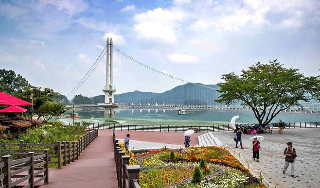 충남 예산군에 위치한 예당호 출렁다리는 우리나라에서 가장 큰 저수지인 예당호 위에 놓인 국내 최장 402m 길이의 보행 현수교다.