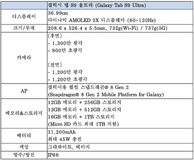 갤럭시 탭 S9 시리즈는 8월 11일 부터 출시를 하고 7월 27일부터 8월 3일까지 사전 판매를 진행합니다. 색상은 그라파이트, 베이즈 2가지 색상이 있고 갤럭시 탭 S9 울트라는 159만 8천 3백원~240만 6천8백원, 갤럭시 탭 S9+는 124만 8천5백원~163만 7천9백원, 갤럭시 탭 S9은 99만 8천8백원에서 138만 8천2백원으로 구성되어 있습니다.