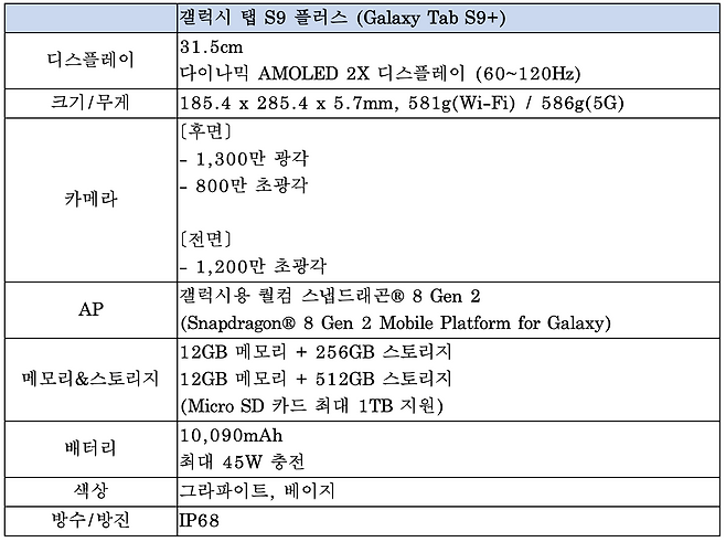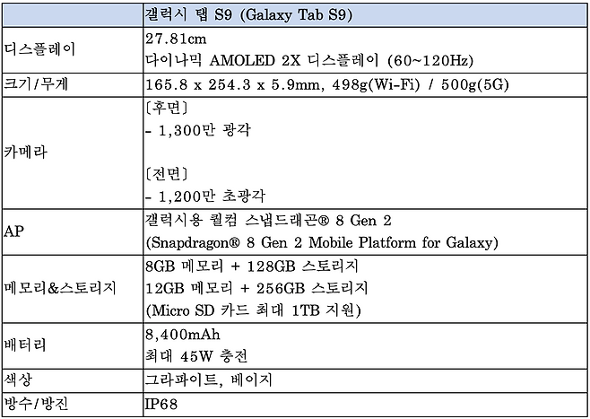 갤럭시 탭 S9 시리즈는 갤럭시 탭 S시리즈 최초로 IP68 등급의 방수방진 기능을 탑재한 것이 특징입니다. 물로 부터도 태블릿PC도 조금 더 자유롭게 사용할 수 있게 준비되었습니다.