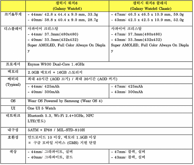 갤럭시워치6 시리즈는 8월 11일부터 출시하고 7월 27일부터 8월 7일까지 사전판매를 진행합니다. 갤럭시워치6 44mm 색상은 그라파이트, 실버 색상이 있고 40mm 모델은 그라파이트, 골드 색상이 있습니다. 가격은 44mm 블루투스 모델 36만 9천원, 40mm 블루투스 모델 32만 9천원, 44mm LTE 39만 9천 3백원, 40mm LTE 35만 9천8백원 입니다.