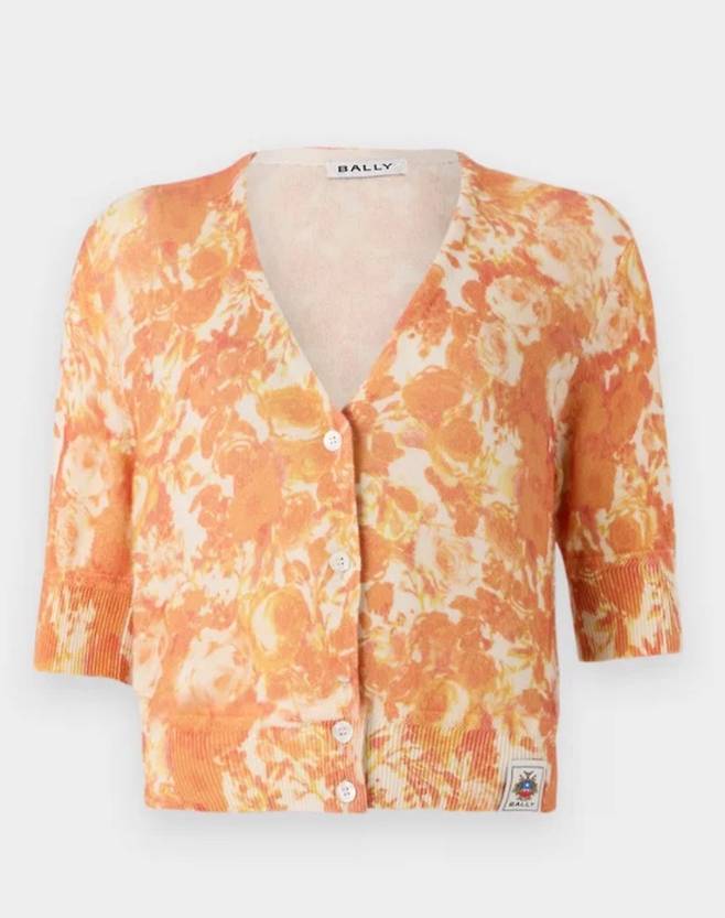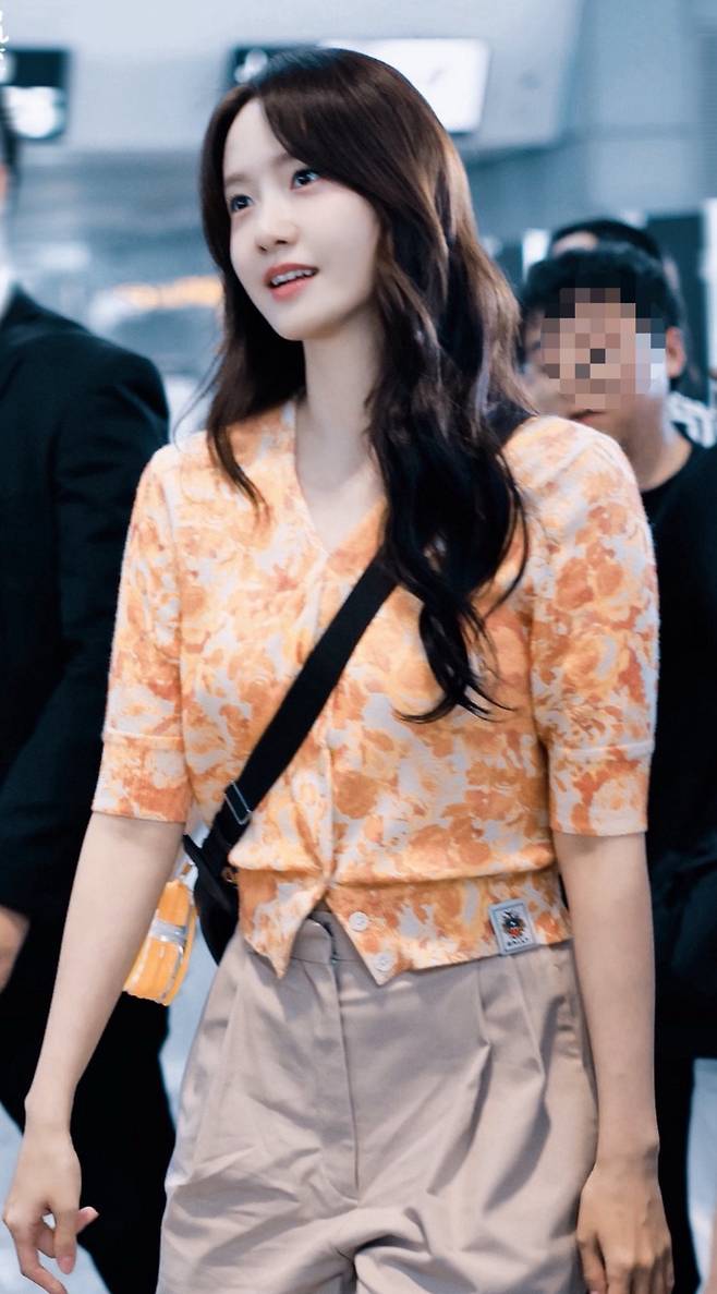 윤아의 공항룩에서 가장 먼저 눈에 들어온 건 오렌지 플라워 패턴의 크롭 가디건이었어요.