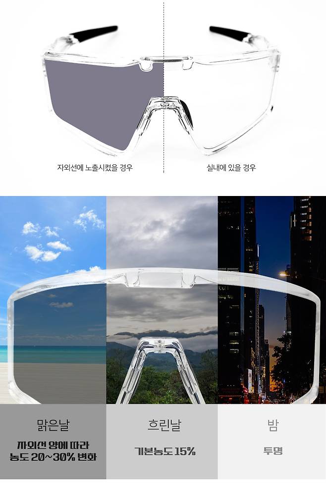 실외 자외선의 강도에 따라 변색 정도를 증가 또는 감소시켜 눈을 보호해줍니다