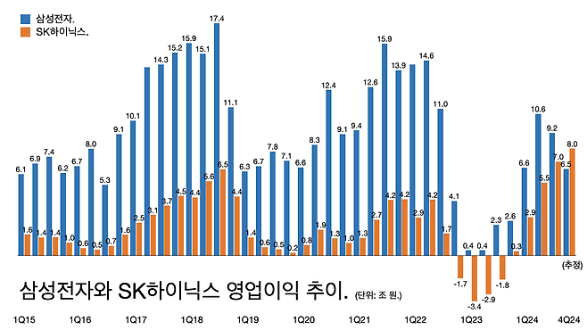 4분기 영업이익이 SK하이닉스에 뒤처졌다는 분석도 나온다. SK하이닉스는 아직 실적 발표 전이지만 8조 원 가까이 영업이익을 냈을 거라는 게 증권사 전망 평균이다. 반도체 부문만 놓고 보면 이미 3분기부터 역전됐다.