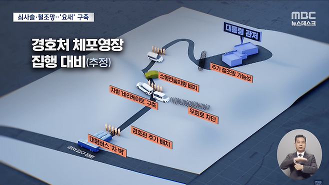 관저 정문에 대형 버스 7대로 차벽을 세웠다. 외벽에는 50cm 길이의 철침을 박은 철조망을 둘렀다.