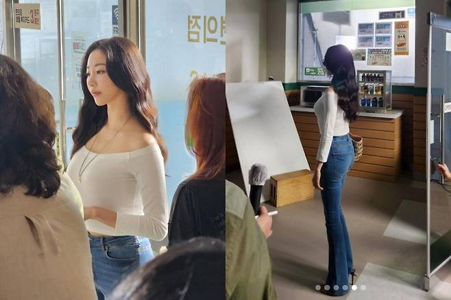 특히 몸매가 드러나는 딱붙는 티셔츠에 청바지 착장을 공개해 화제입니다.