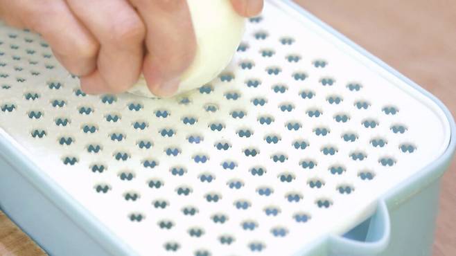 여기서 중요 포인트! 이제 중간 크기 양파 1/4개를 강판에 갈아주세요. 양파는 자연스러운 단맛과 감칠맛을 더하고 풍미를 풍성하게 해 준답니다. 또, 감자의 갈변을 늦춰 더욱 먹음직스러운 감자전을 만들 수 있어요.