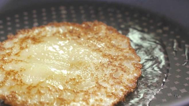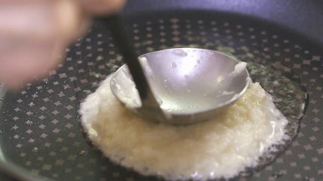 충분히 달궈진 프라이팬에 반죽을 한 국자 떠서 팬에 살짝 도톰하게 펴줍니다. 너무 얇으면 바삭하지만 속이 메말라요. 살짝 두툼하게 부쳐야 겉은 바삭, 속은 쫀득 맛있습니다.
